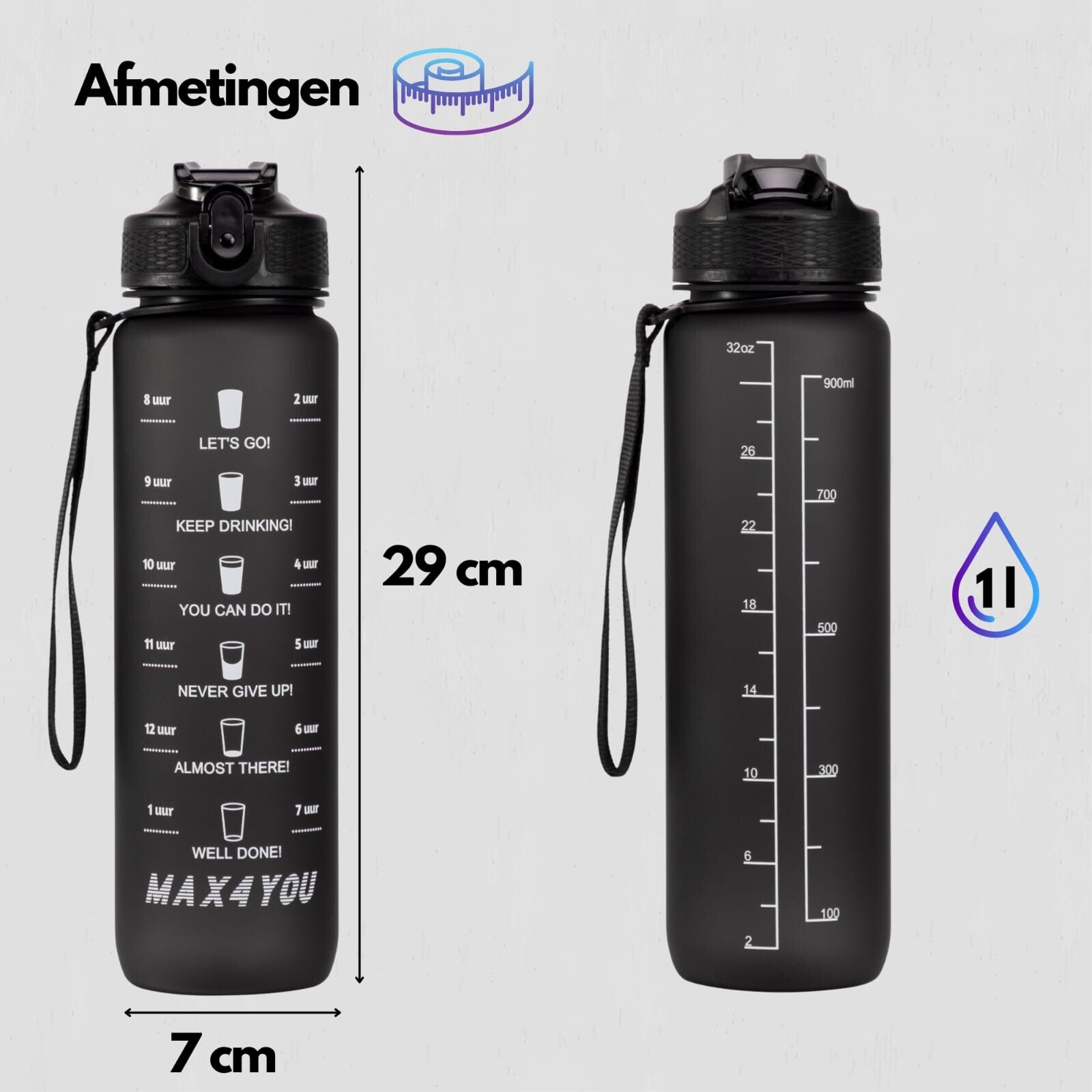 Een motiverende waterfles met een inhoud van 1 liter is niet alleen een praktische watercontainer, maar ook een inspirerende gadget die bedoeld is om je te ondersteunen en motiveren bij het behouden van een gezonde levensstijl en het regelmatig hydrateren van je lichaam door voldoende water te drinken.